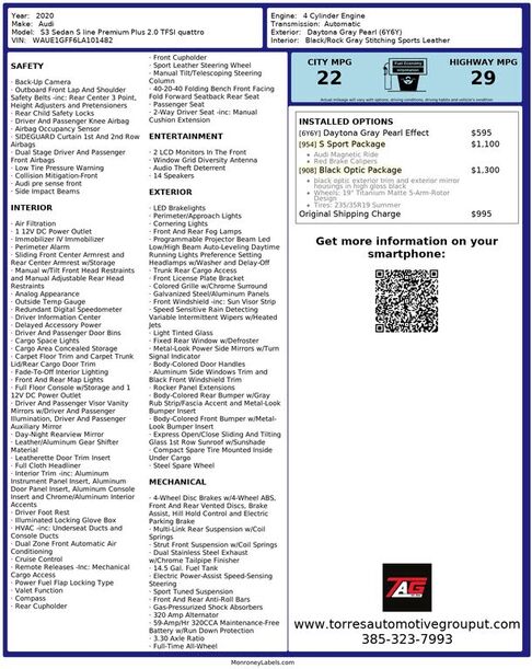 The 2020 Audi S3 Sedan S line Premium Plus 2.0 TFSI quattro is a remarkable blend of power and sophistication, wrapped in the elegant Exterior Color of Daytona Gray Pearl Effect. This sedan commands attention on the road with its aggressive stance an...