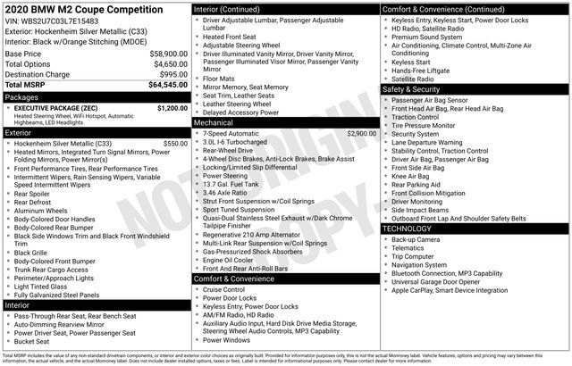 Recent Arrival! Silver Metallic 2020 BMW M2 Competition RWD 7-Speed Automatic 3.0L I6 Executive Package (Adaptive Full LED Lights, Automatic High Beams, Heated Steering Wheel, Speed Limit Info, WiFi Hotspot, and Wireless Charging), 12 Speakers, 4-Wh...