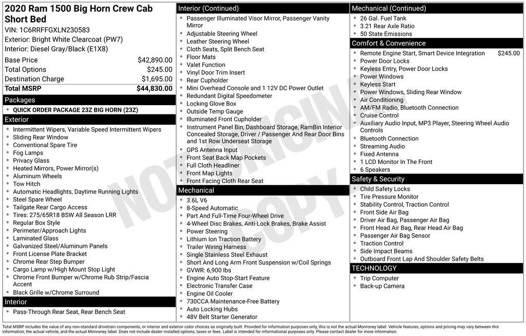 Bright White Clearcoat 2020 Ram 1500 Big Horn/Lone Star 4WD 8-Speed Automatic 3.6L V6 24V VVT 3 Rear Seat Head Restraints, 3.21 Rear Axle Ratio, 4 Way Front Headrests, 4-Wheel Disc Brakes, 48V Belt Starter Generator, 6 Speakers, ABS brakes, Air Condi...