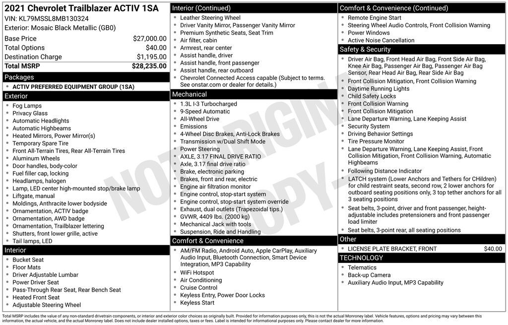 Discover the perfect blend of style, capability, and technology in this stunning 2021 Chevrolet TrailBlazer ACTIV. With its sleek black exterior and impressive 1.3L Ecotec Turbo engine, this SUV is ready to take on any adventure with confidence and f...