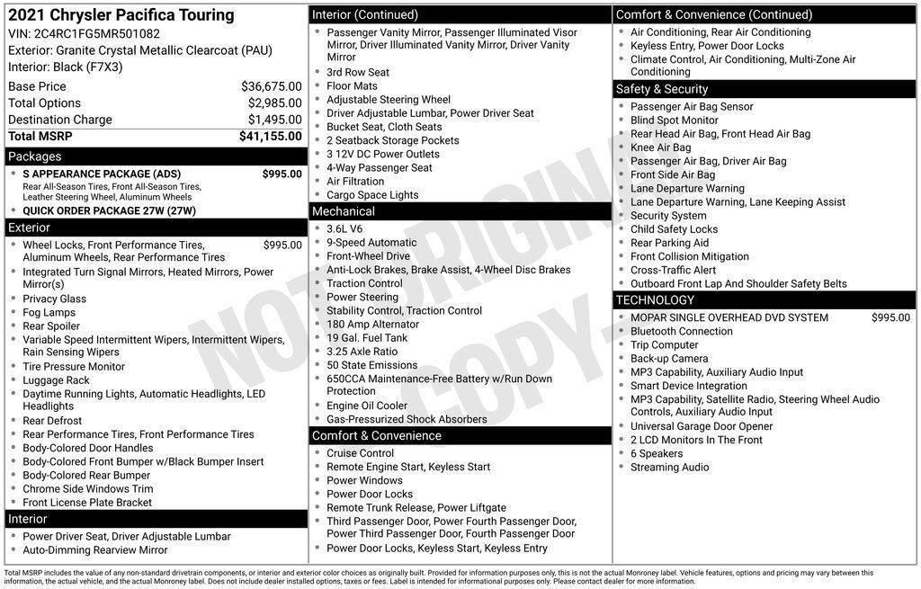 Recent Arrival! Clean CARFAX. This vehicle located at Southern of Norfolk 2747 N Military Hwy Norfolk VA (across from the airport. Granite Crystal Metallic Clearcoat 2021 Chrysler Pacifica Touring FWD 9-Speed 948TE Automatic 3.6L V6 24V VVT 19/28...