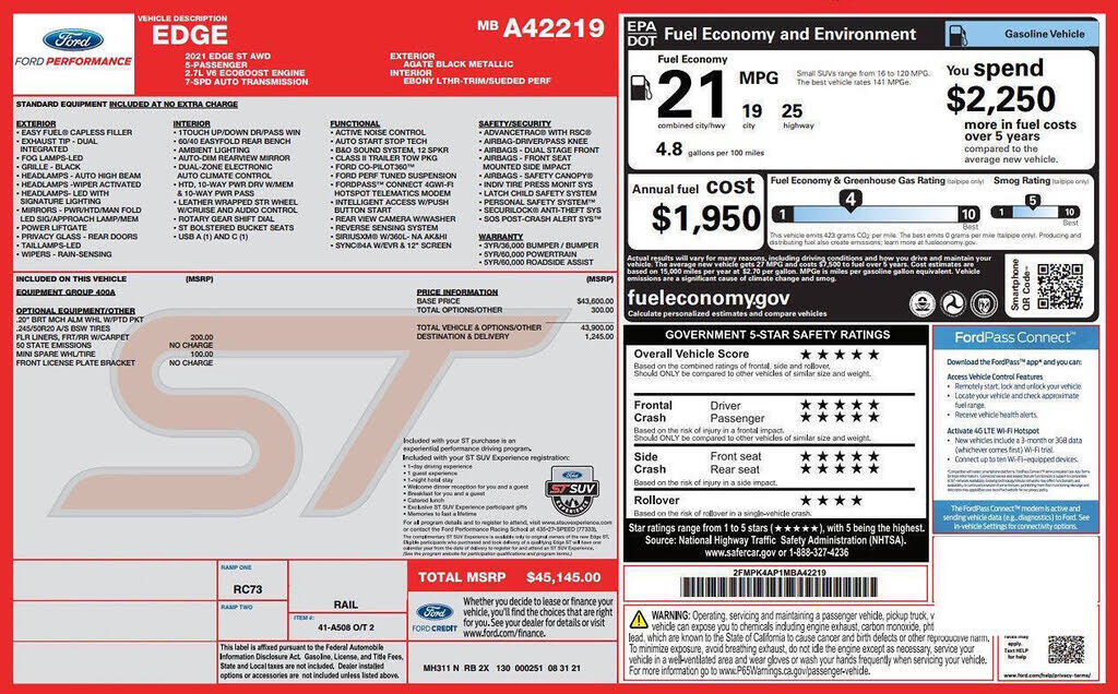 Just arrived! This 2021 Ford Edge ST AWD has only 49,000 miles! Under the hood, you'll find a EcoBoost 2.7L Twin Turbo V6! Loaded with options including Heated leather/Suede, 12 Touchscreen, Keyless entry with push-button start, LED lighting, and...