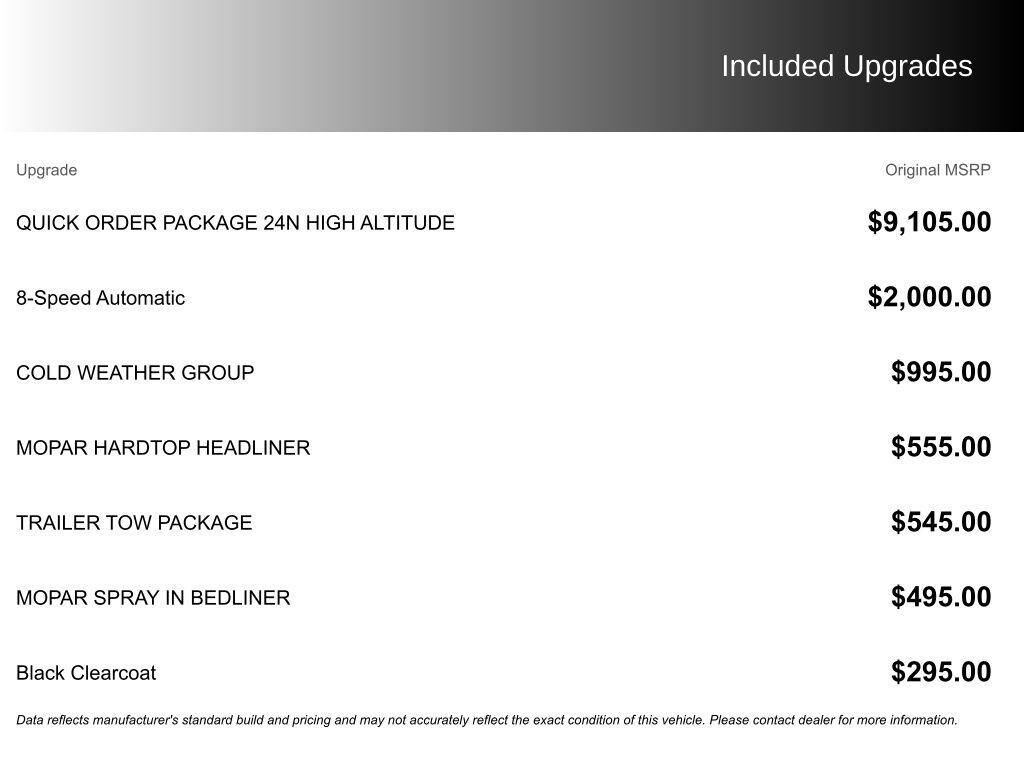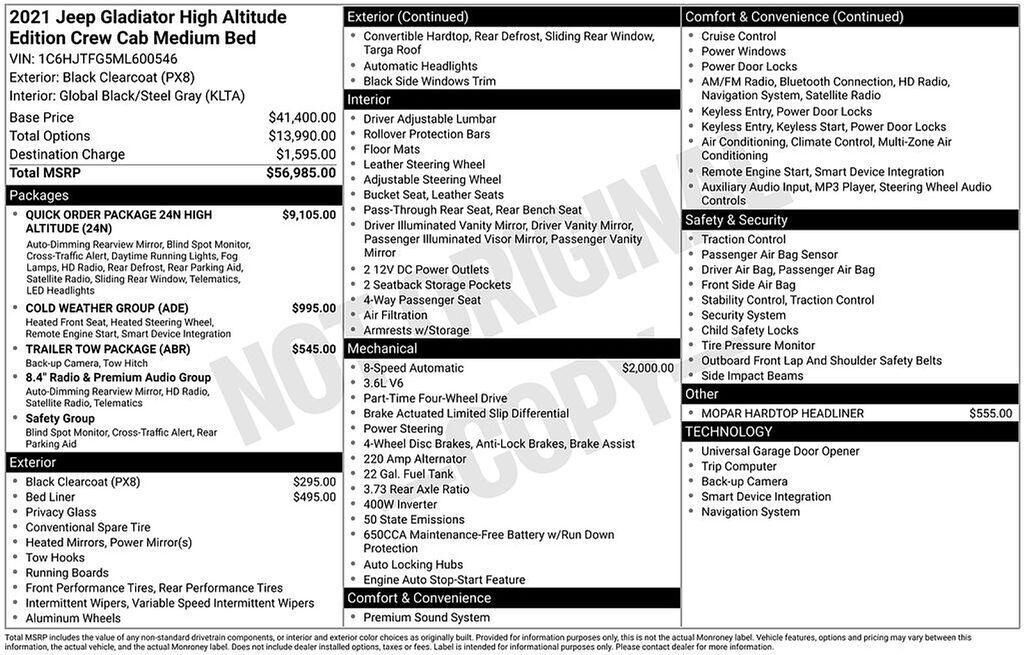 Black Clearcoat 2021 Jeep Gladiator High Altitude 8-Speed Automatic 3.6L V6 24V VVTCold Weather Group,Quick Order Package 24N High Altitude,Safety Group,LED Lighting Group,Trailer Tow Package,8.4" Radio and Premium Audio Group,50 State Emissions,3.6L...