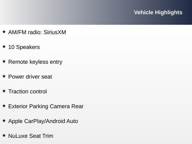 Radio: AM/FM/CD Player -inc: multimedia system w/8" color display touchscreen HD Radio 10 speaker Pioneer audio system Android Auto and Apple CarPlay integration USB audio input connections Bluetooth® hands free Bluetooth® streaming audio Connected services and Integrated SiriusXM Satellite radio receiver (complimentary 90-day trial subscription)