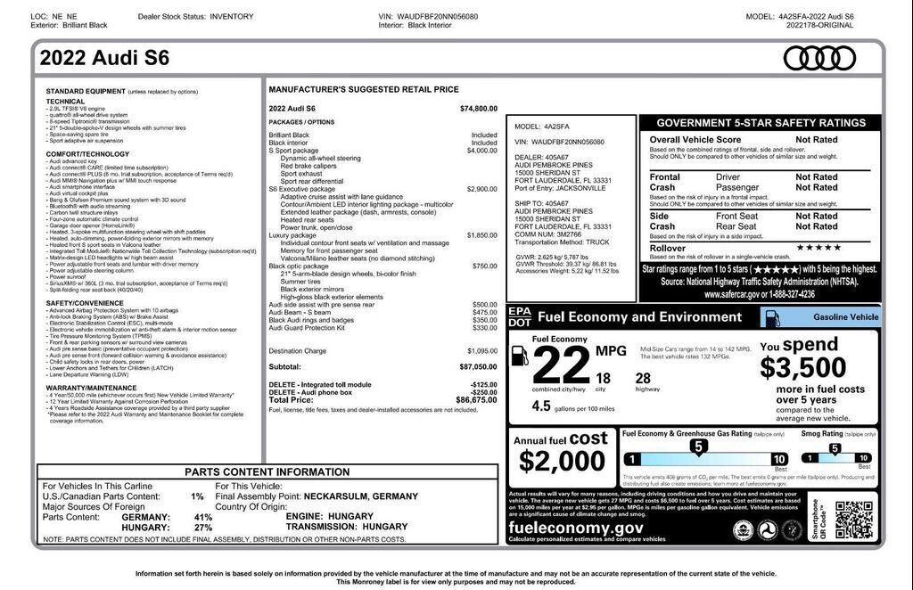 Beautiful 2022 Audi S6 2.9T quattro Premium Plus with 13,179 miles. Finished in Brilliant Black on Black. This S6 comes equipped with multiple option packages including: Black Optic Package ($750 value)Black Optic Exterior PackageBlack Exterior M...