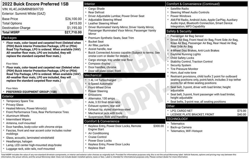 Preferred Equipment Group 1SB,3.53 Final Drive Axle Ratio,18" Aluminum Wheels,Cloth w/Leatherette Seat Trim,Radio: 7" Diagonal Buick Infotainment System,Ride & Handling Suspension,Cargo Net,Remote Vehicle Starter System,Front License Plate Bracket,2-...