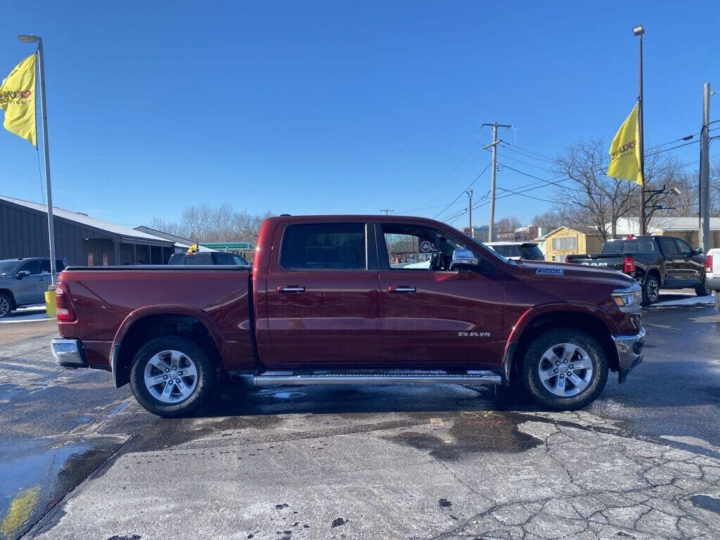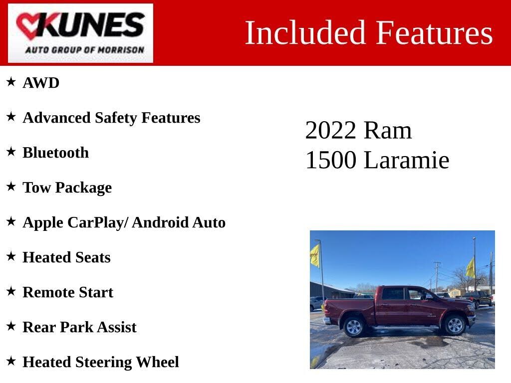 2022 Ram 1500 Laramie Delmonico Red Pearlcoat 4WD HEMI 5.7L V8 Multi Displacement VVT Recent Arrival! CARFAX One Owner. Laramie Level A Equipment Group with cross-traffic alert, rear parking sensors, rain-sensing wipers, remote tailgate release, an...