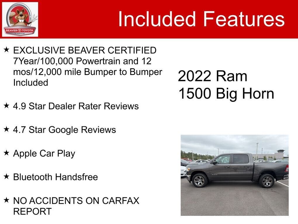 Clean CARFAX. 4.9 Star Dealer Rater Reviews, 4.7 Star Google Reviews. Granite Crystal Metallic Clearcoat 2022 Ram 1500 Big Horn/Lone Star 4WD 3.6L V6 24V VVT We provide you with world class service using the most advanced technology to service you...