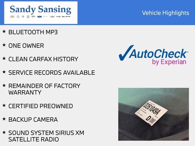 Odometer is 11717 miles below market average! BLUETOOTH MP3, ONE OWNER, CLEAN CARFAX HISTORY, SERVICE RECORDS AVAILABLE, REMAINDER OF FACTORY WARRANTY, CERTIFIED PREOWNED, BACKUP CAMERA, SOUND SYSTEM SIRIUS XM SATELLITE RADIO, POWER WINDOWS, POWER D...