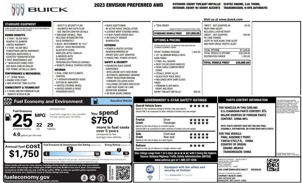 Preferred Equipment Group 1SC,3.47 Final Drive Axle Ratio,Wheels: 18" Aluminum w/Light Charcoal Met Finish,Wheels: 20" Aluminum w/Dark Finish,Cloth w/Leatherette Seat Trim,Radio: Buick Infotainment System AM/FM Stereo,Not Equipped w/Lane Change & Rea...