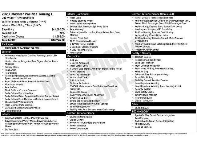 The 2023 Chrysler Pacifica Touring L is a remarkable minivan that offers the perfect blend of style, functionality, and advanced technology. With its sleek exterior design, spacious interior, and a host of premium features, this vehicle is the ideal...