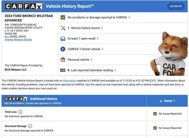To be more confident in your used car purchase and get more information about the auto, including its accident history, insurance records, odometer readings history and other important details, we recommend you get a vehicle history report for the car prior to buying it.