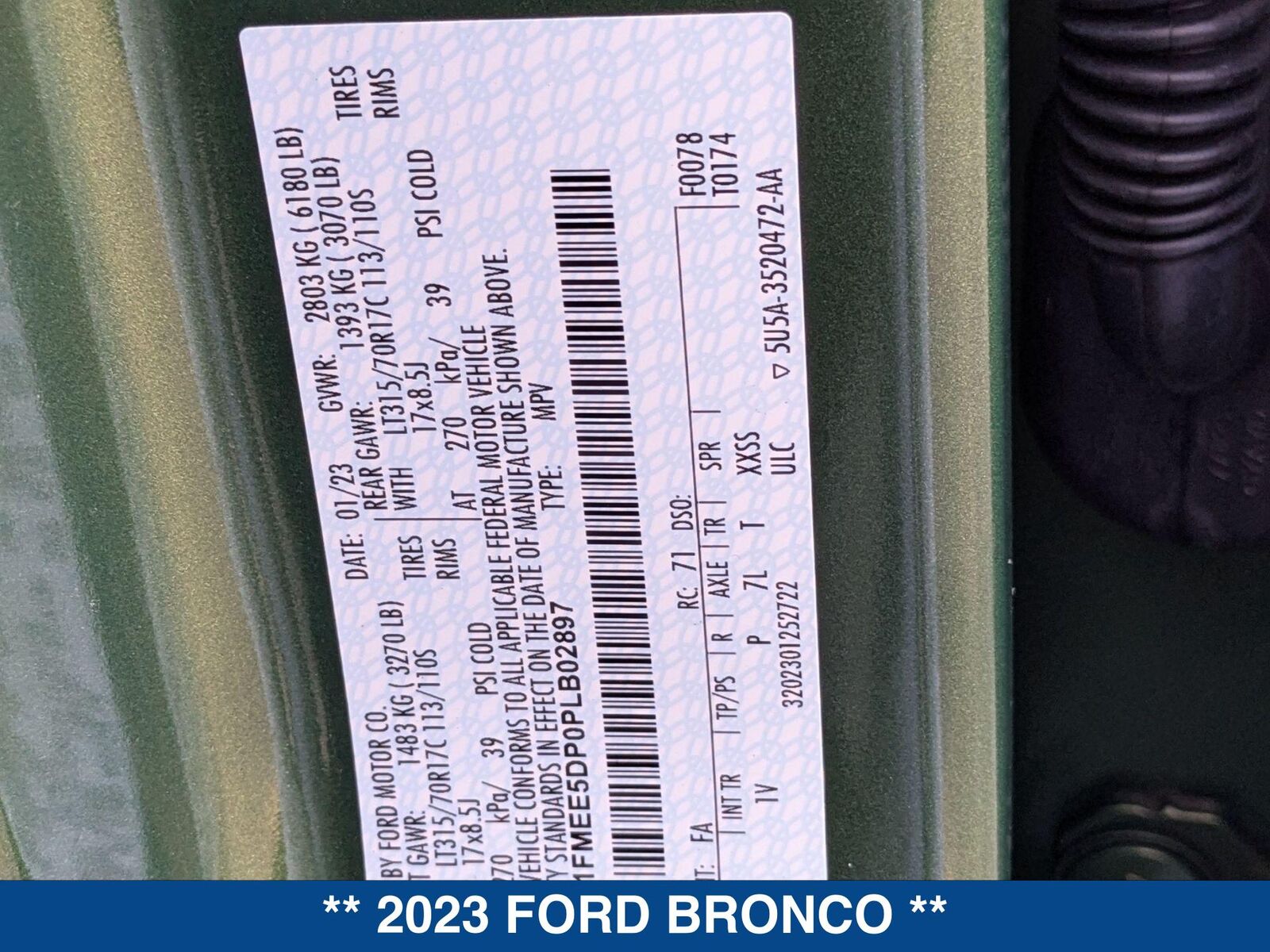 2.7L ECOBOOST V6 ENGINE,Body Armor-Protective Moldings,ERUPTION GREEN METALLIC,FLR LINERS ALL WTHR+CRPT MATS,FRONT BUMPER, HD MODULAR,FRONT LICENSE PLATE BRACKET,SOUND DEADENING HEADLINER,Top/Retractable/Full Twill Sft,VINYL BLACK SEATS,Wheel Lock Ki...