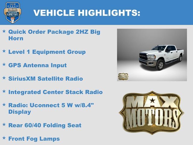 Recent Arrival!CARFAX One-Owner.Bright White Clearcoat 2023 Ram 2500 Big Horn4D Crew Cab Big Horn 4WD Cummins 6.7L I6 Turbodiesel2 Way Rear Headrest Seat, 2nd Row In Floor Storage Bins, 4 Way Front Headrests, 40/20/40 Split Bench Seat, 4G LTE Wi-Fi H...