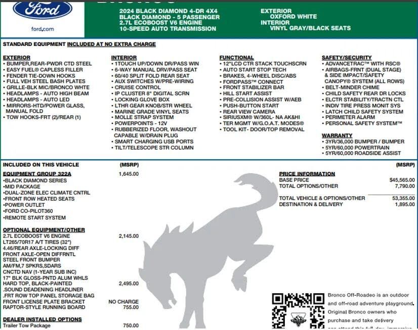 ADDED FEATURES:BLACK DIAMOND SERIESMID PACKAGEDUAL-ZONE ELEC CLIMATE CNTRLFRONT ROW HEATED SEATSPOWER OUTLETFORD CO-PILOT360 REMOTE START SYSTEM2.7L ECOBOOST V6 ENGINELT265/70R17 A/T TIRES (32")4.46/REAR AXLE-LOCKING DIFFFRONT AXLE-OPEN DIFFRNTLSTEEL...