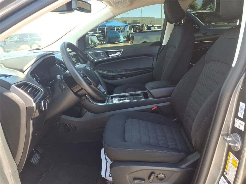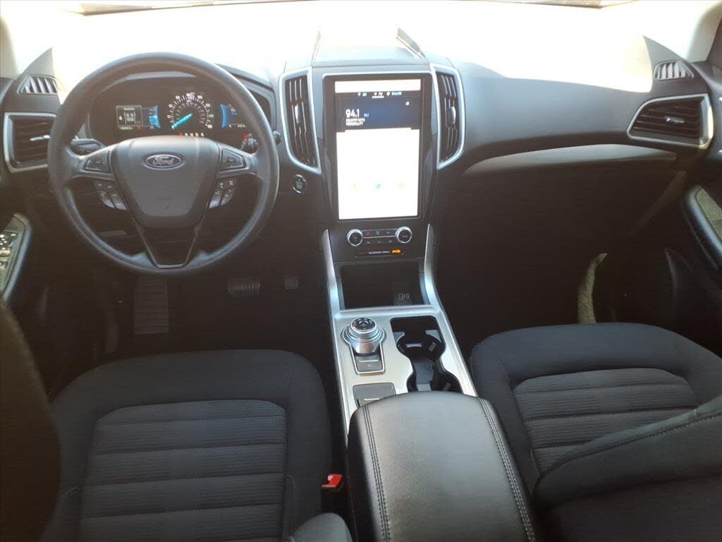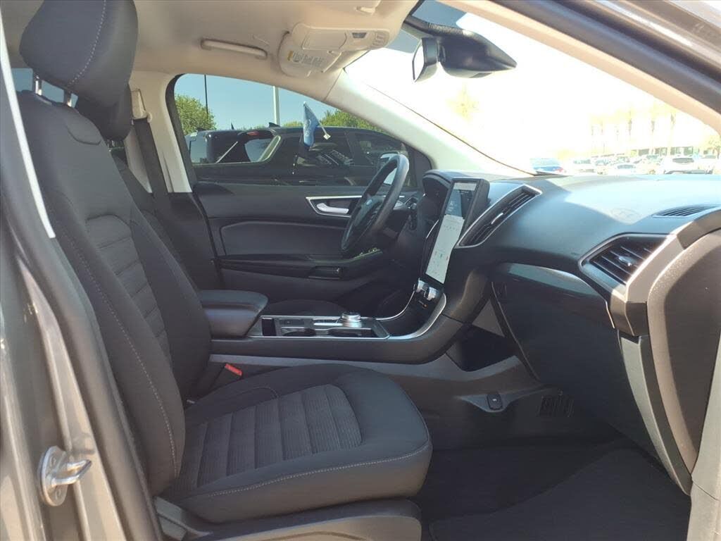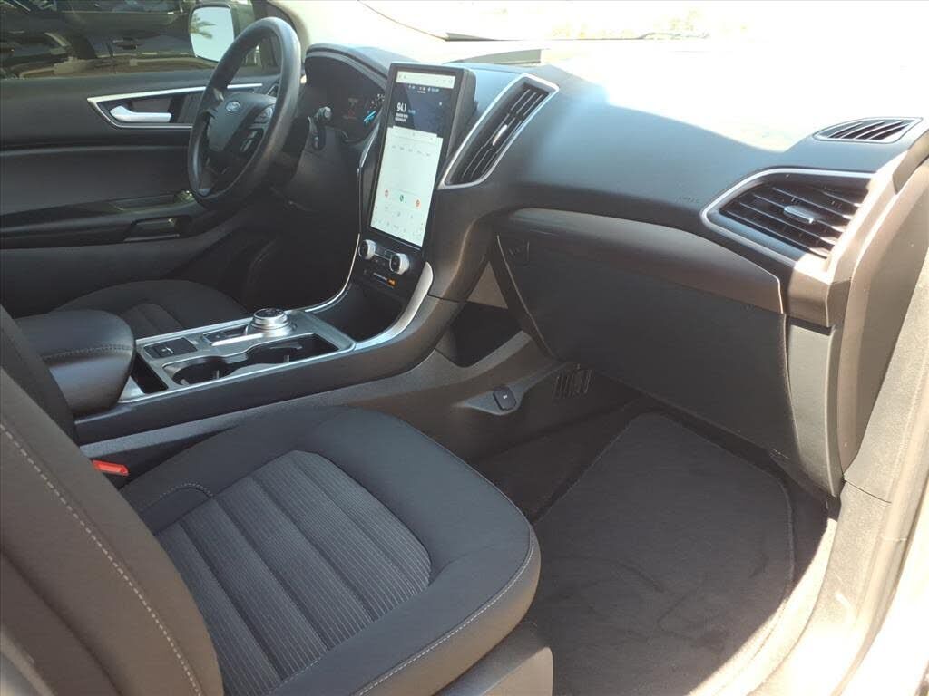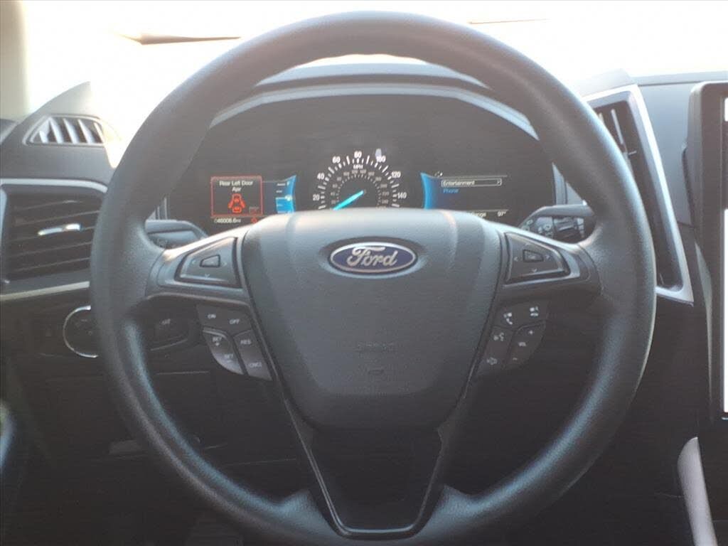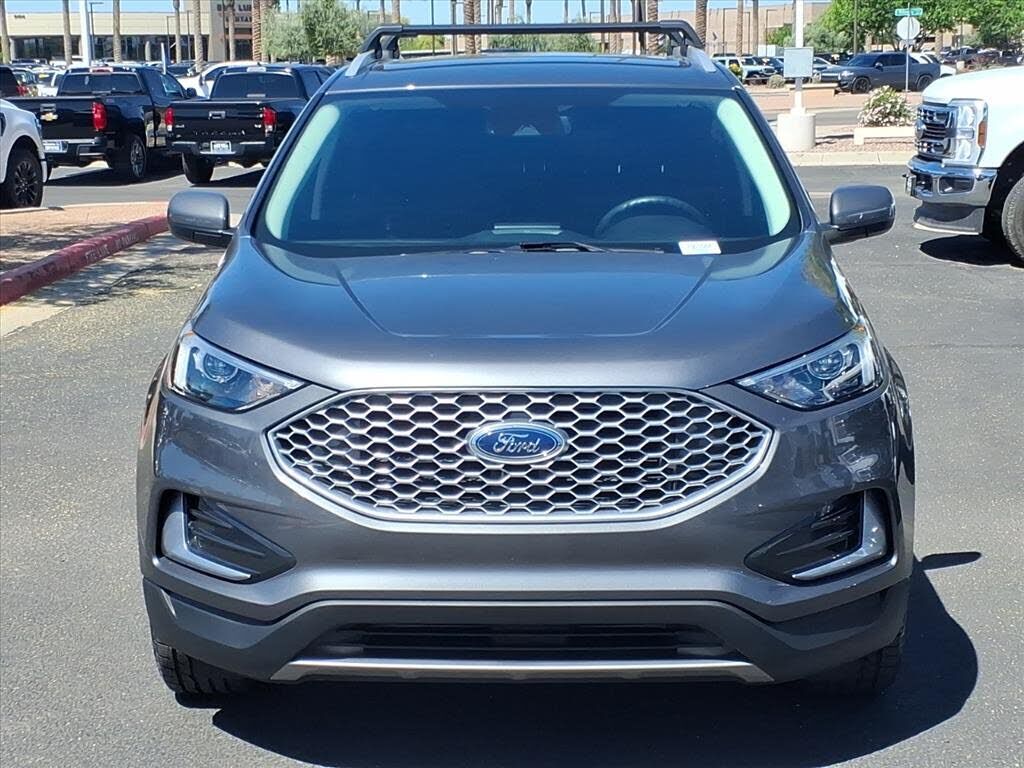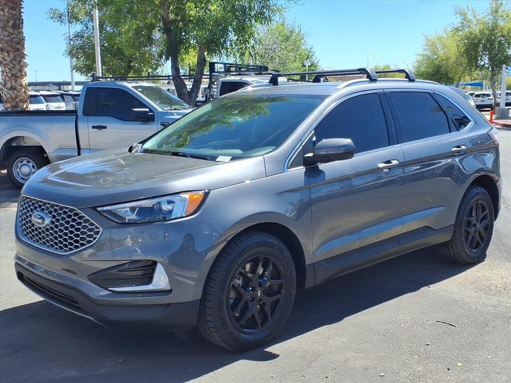 This vehicle is a 2024 Ford Edge SEL Crossover all wheel drive, certified pre-owned with 45,994 miles. It has a 2.0 liter 4 cylinder engine with turbocharging, and an ebony exterior with a carbonized gray metallic interior. It has a crash test rating...