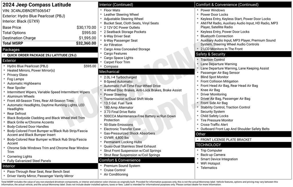 2024 Jeep Compass Latitude Hydro Blue PearlcoatApple Carplay/Android Auto, Backup Camera, Blind Spot Monitoring, Bluetooth, LED Headlamps, Lane Departure, Price Forever Package, Compass Latitude, 4D Sport Utility, 2.0L I4 DOHC, 8-Speed Automatic, 4WD...
