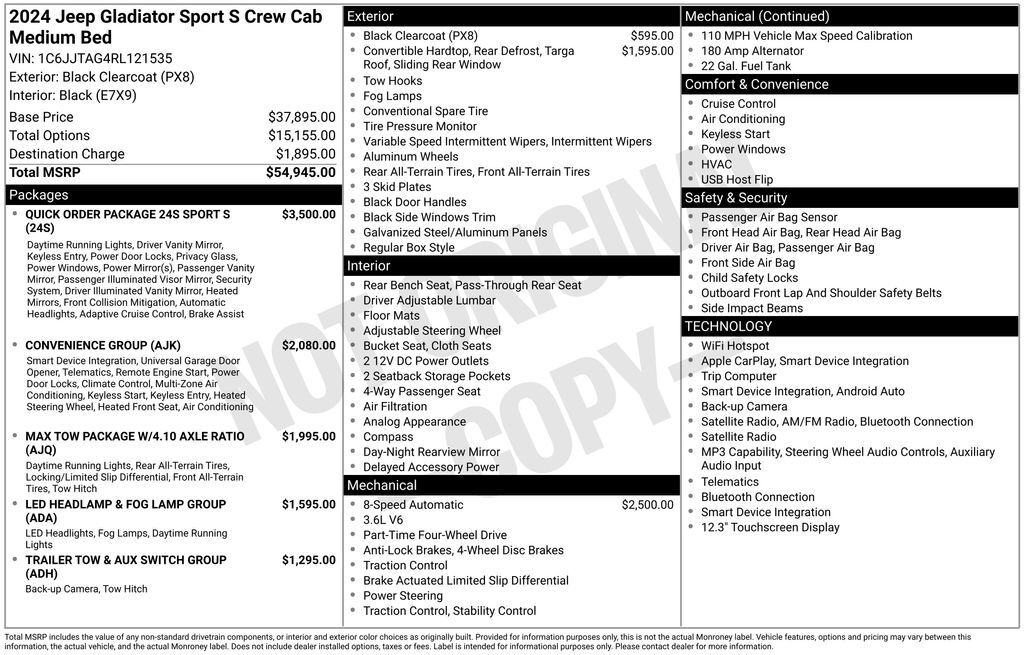 2024 Jeep Gladiator Sport Recent Arrival! CARFAX One-Owner. Clean CARFAX. Black Clearcoat 4WD 3.6L V6 24V VVT 8-Speed Automatic Apple CarPlay® & Android AutoTM, Touchscreen Controls, Backup Camera, Keyless Access w/ Push Start, Automatic Headlights...