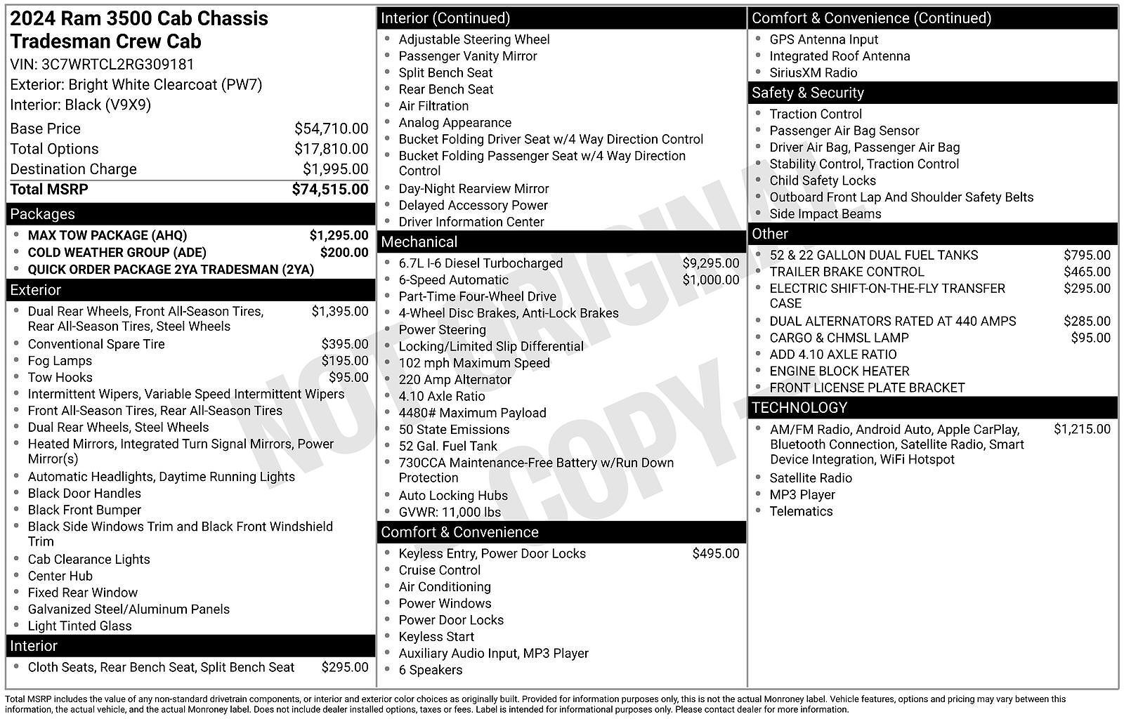 Priced below KBB Fair Purchase Price! CARFAX One-Owner. Clean CARFAX. *Ask us about our Easy financing programs???* Bright White Clearcoat 2024 Ram 3500 Tradesman Cummins 6.7L I6 Turbodiesel 4WD 4D Crew Cab Aisin 6-Speed Automatic Safety inspected...