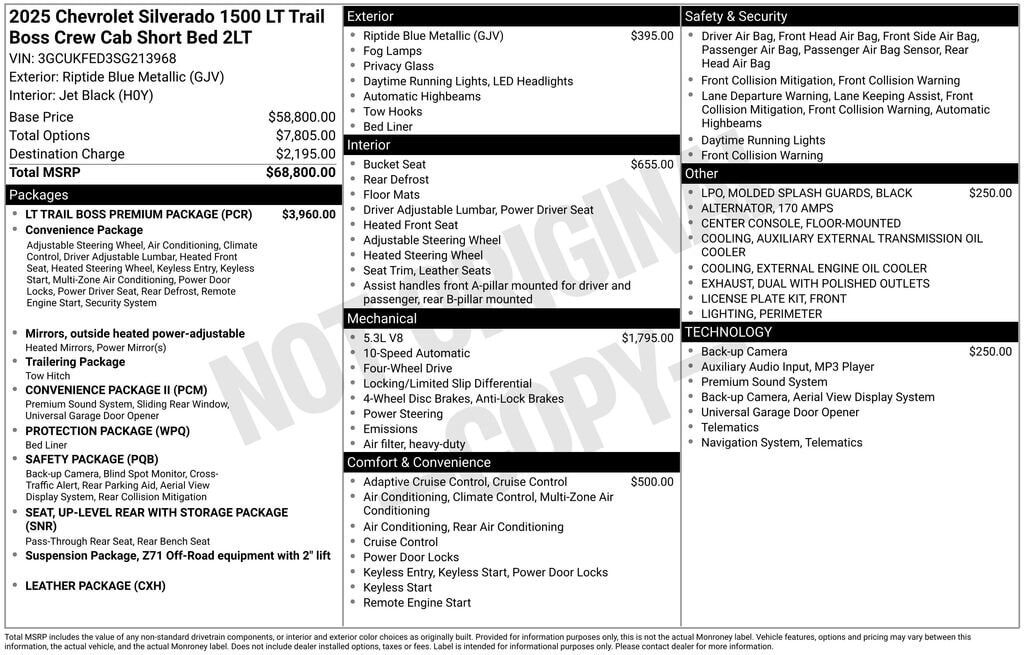 Silverado 1500 LT Trail Boss, 4D Crew Cab, EcoTec3 5.3L V8, 8-Speed Automatic, 4WD, Riptide Blue Metallic, Black Leather, Apple CarPlay/Android Auto, Convenience Package II, HD Surround Vision, Heated front seats, Hitch Guidance w/Hitch View, Power S...