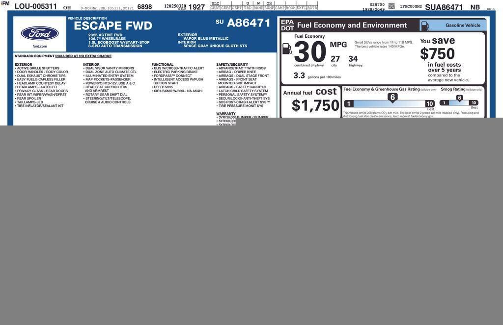 2025 Vapor Blue Ford Escape Active is a clean 1 owner vehicle. This Ford Escape has many features and is well equipped including, AM/FM radio: SiriusXM, Auto High-beam Headlights, Cold Weather Package, Emergency communication system: SYNC 4 911 Assis...