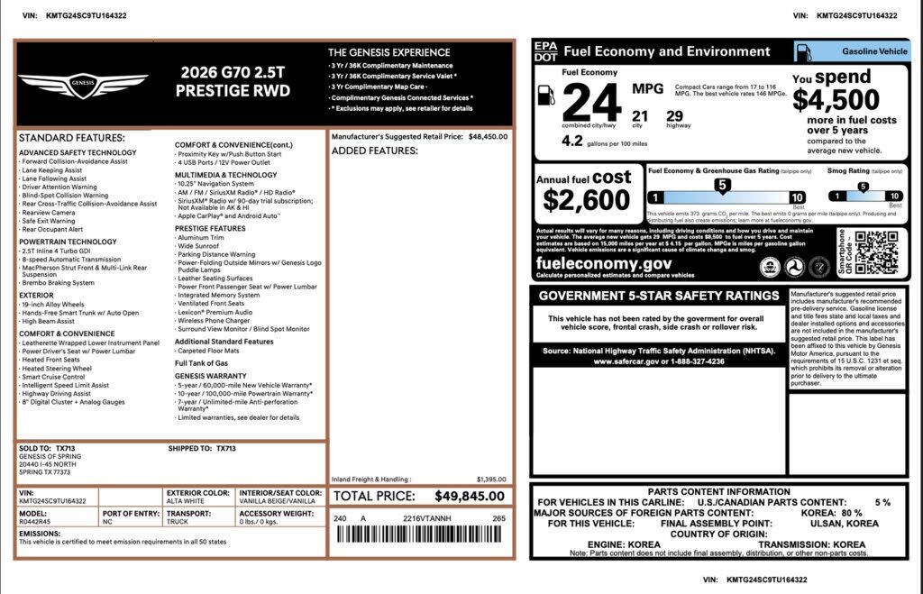 2026 Genesis G70 RWD 2.5T Prestige This Retired Courtesy Loaner is Genesis Certified with over 94,000 miles of Factory Warranty remaining! A CPO has more warranty than a new one; under the GENESIS CERTIFIED Program you get the remainder of the 10 YEA...